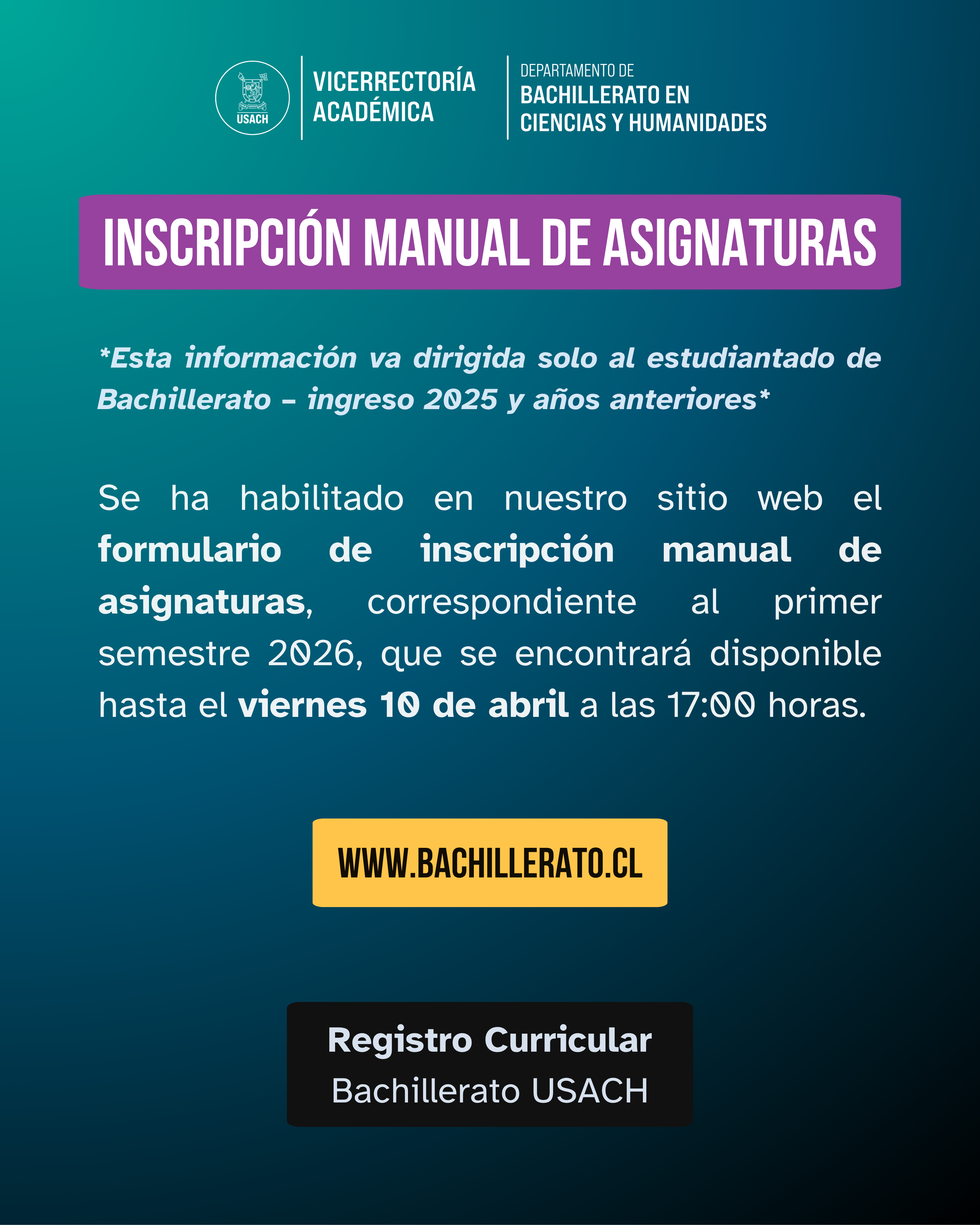 Junto con saludar y esperando se encuentren bien, tenemos el agrado de enviar a ustedes el link del Formulario de inscripción manual de asignaturas, correspondiente al primer Semestre 2026, que se encontrará disponible hasta el día 10 de abril a las 17:00 horas.