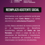 Informamos a ud. que, a contar de hoy, la asistente social que reemplazará a la Sra. Claudia Ponce será la Srta. Carla Baeza, cuyo correo electrónico es: carla.baeza.r@usach.cl