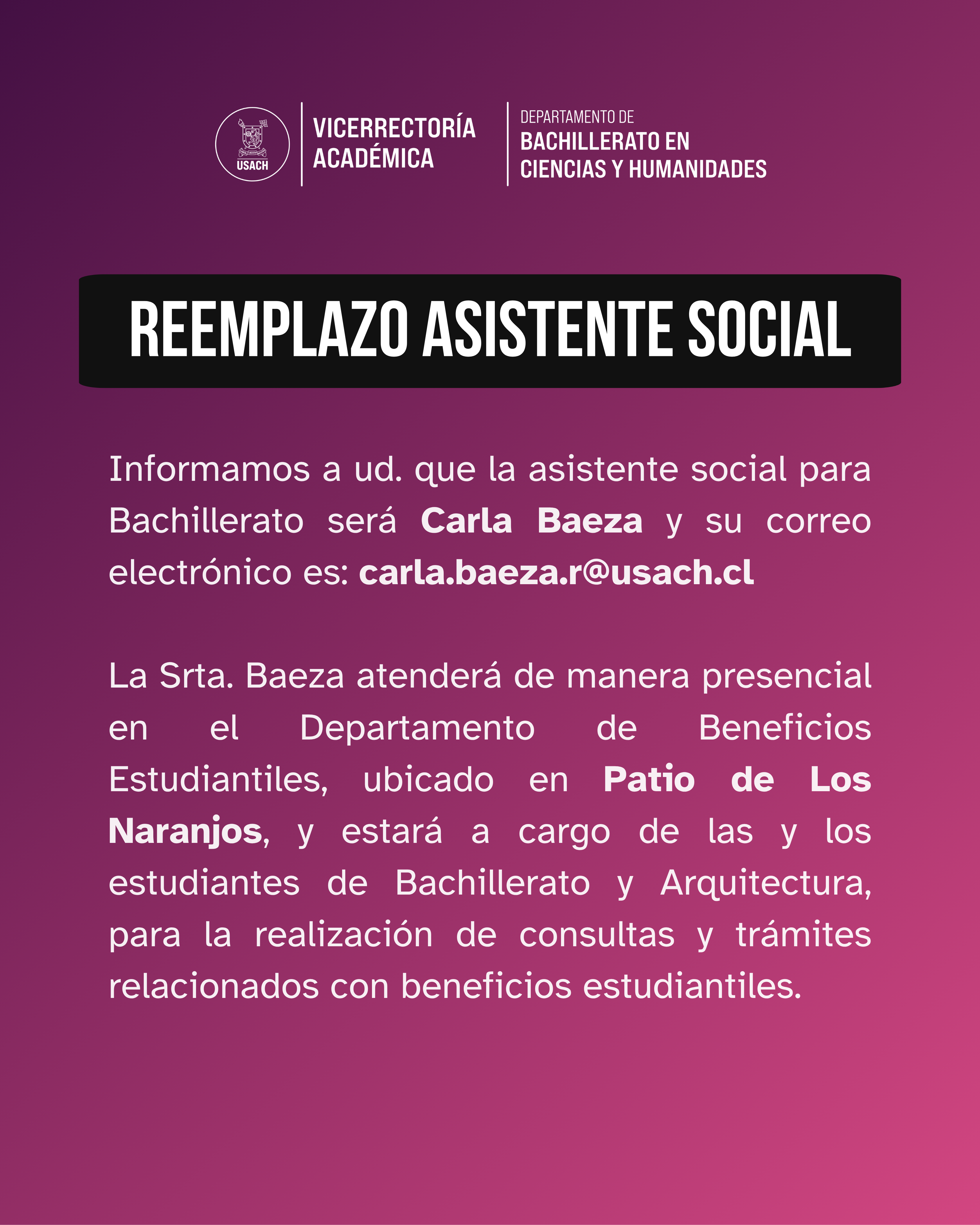 Informamos a ud. que, a contar de hoy, la asistente social que reemplazará a la Sra. Claudia Ponce será la Srta. Carla Baeza, cuyo correo electrónico es: carla.baeza.r@usach.cl
