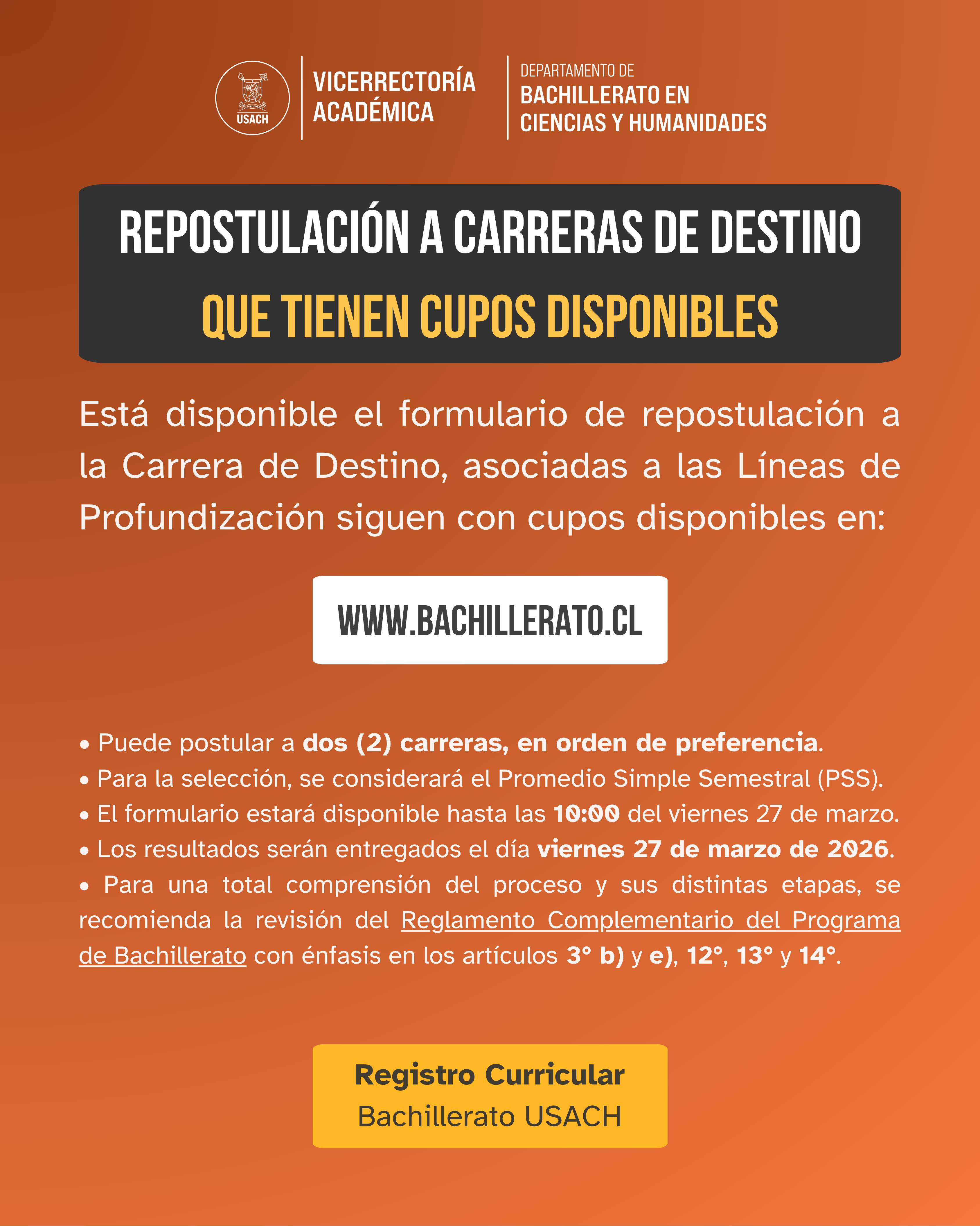• Los resultados de este periodo de repostulación serán entregados en el transcurso del día viernes 27 de marzo de 2026.